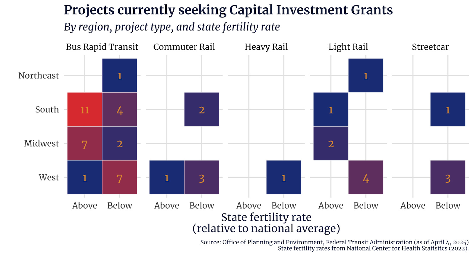Take a look at how many projects in states with above-average fertility rates are already looking to expand bus rapid transit lines (think Huntsville, AL, Raleigh, NC, Salt Lake City, UT, and Houston, TX). It’s entirely logical for federal grantmakers to prioritize these relatively cheap, more flexible, and easy to scale programs over permanent rail infrastructure in states with lower population trajectories (like streetcar projects in Sacramento, Portland, and Seattle). Indeed, if San Franciscans are choosing to raise more dogs than children, it would be long-term policy malpractice not to ensure federal infrastructure spending goes toward places that will most certainly be needing new buses, light rail, or highway miles before too long.