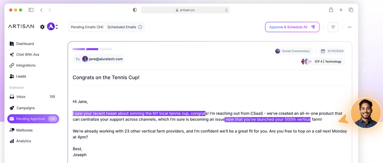 Actually, their best example of their biggest product, featured on their homepage, is a bot that will scan social media to find personal details about you so that it can then send you spam congratulating you on your recreational tennis victory before trying to sell you an “all-in-one product that can centralize your support across channels.”