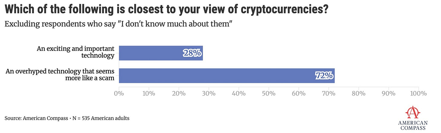 Among Americans with an opinion about cryptocurrency, 72% see it as an overhyped scam while only 28% consider it an exciting and important technology.