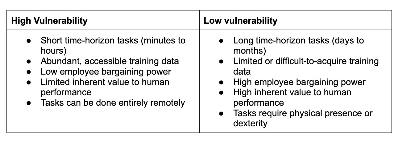 Remote work replaceability. The most vulnerable jobs are those that can be replaced by a drop-in remote worker. If access to email, Slack, well-scoped tasks, the regular onboarding materials, and occasional manager check-ins are all that’s required, a job becomes very straightforward to automate. And the lockdowns during the COVID-19 pandemic made clear that a very large fraction of the economy may be done remotely.