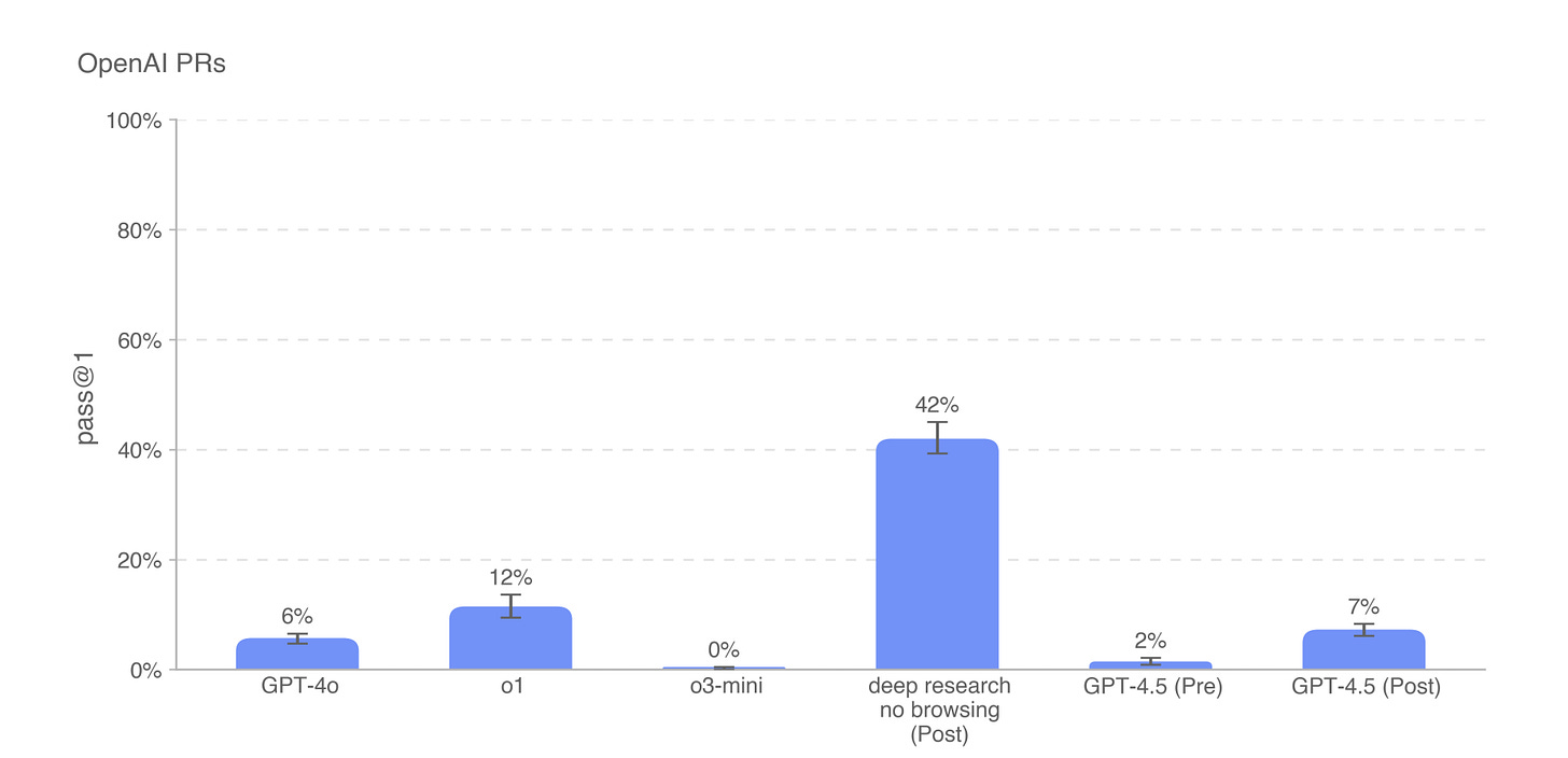 Software engineers whose jobs are based on writing code as discrete, well-documented tasks (often following standardized updates to a central directory) are essentially creating the perfect training data for AI systems to replace them. Indeed, OpenAI reports that their latest “Deep Research” model can successfully replicate 42% of OpenAI employee’s “pull requests”—actual coding tasks previously done by their own engineers.