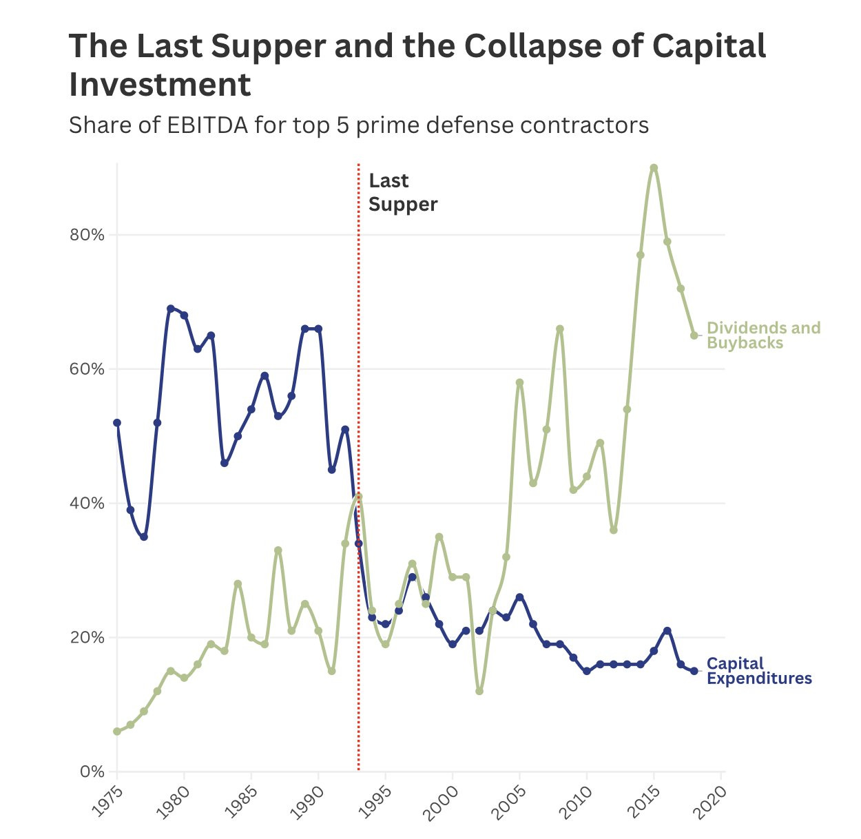 But the same problem extends far beyond the defense sector. In all the places where the United States needs more capital investment—energy infrastructure, shipbuilding, advanced manufacturing, critical minerals, residential housing—financial engineering can pull in the opposite direction. If Washington is willing to say that buybacks and dividends in the defense sector are inconsistent with the national interest, it should apply the same analysis to other industries that require greater capital investment. No principle of economics would limit the disconnect between shareholder return, industrial capacity, and economic progress to tanks and missiles. — Daniel